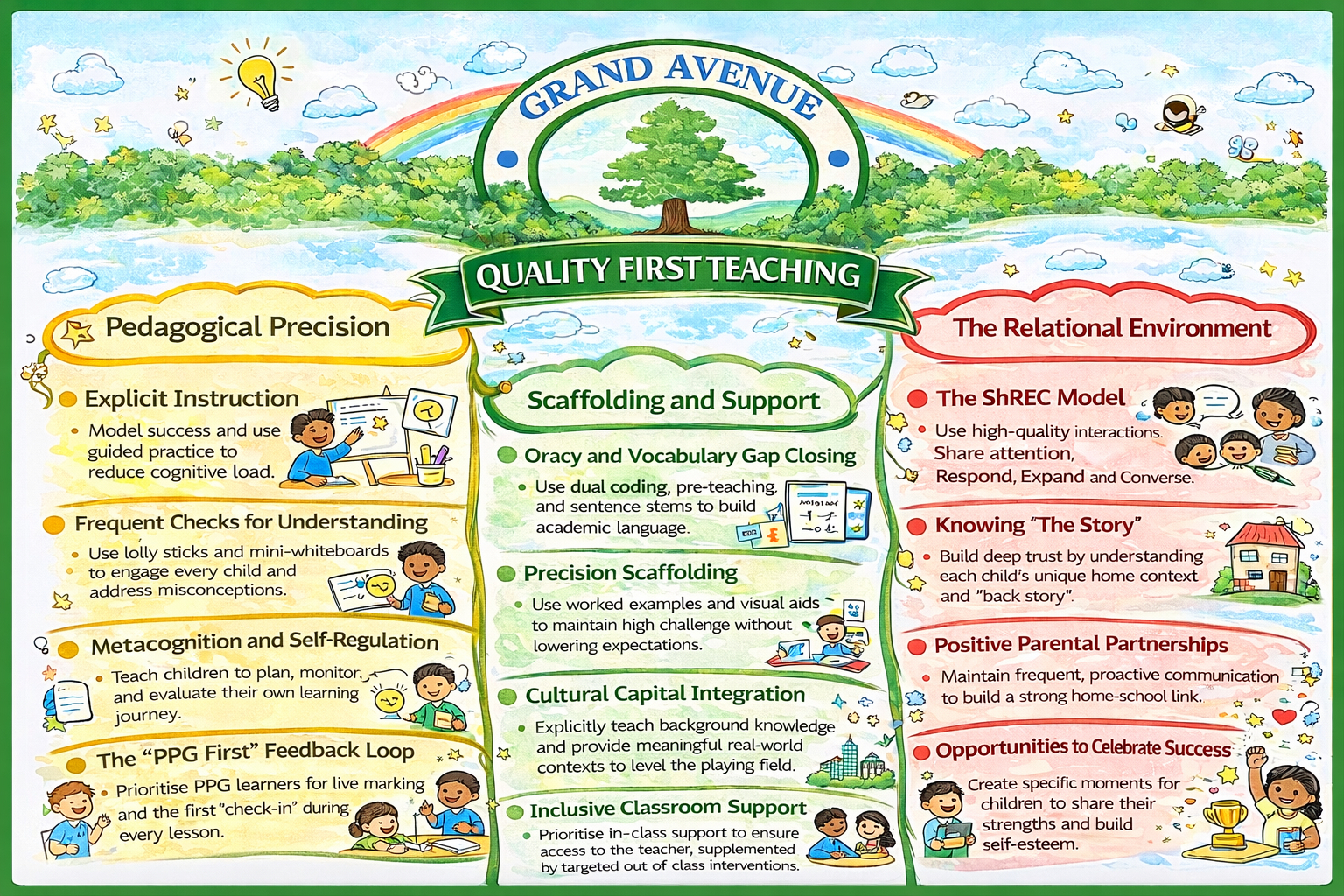 At Grand Avenue Primary and Nursery School, we ensure all children, regardless of their background, are able to access quality first teaching (see image below), high quality interventions and support across all areas of school life, making progress in line with their peers. We actively promote equality of opportunity for all staff, children and families, enabling all to achieve well.
